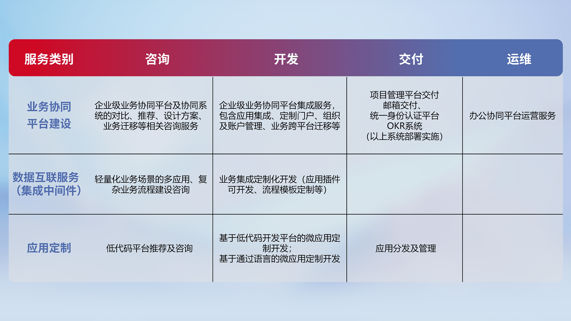 针对钉钉、、、企微、、、、IDaas等平台级产品提供产品的规划、、方案、、交付、、、、定制化开发等服务,,,,实现如统一协同办公、、、、智能客户服务、、、混合会议管理、、、智能数据查询、、、、等业务场景,,,,实现数字化转型。。。